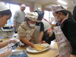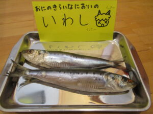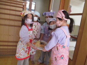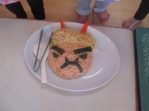 そしてこの日の給食は「節分」がテーマのごちそうでした。鬼ライス、いわしのフライ、ひじきの豆煮、大根の味噌汁、でこぽん、おやつは黒ゴマ蒸しパンです。鬼ライスの盛り付けはびわ組さんが担当してくれました。