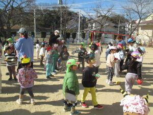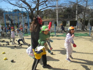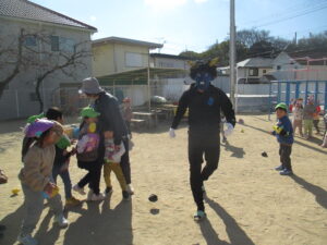 幼児の部は園庭で行いました。鬼の嫌いなヒイラギ、イワシを触って「トゲトゲでゆびのかわがめくれそう」「うわ~~~チクチクや~」「くっっさぁ~」「つるつるする」と顔をしかめて言っていました。すると本物の赤鬼、青鬼が登場!持っていた豆を投げることも忘れて「ぎゃーーーーーーー!!!」と全速力で逃げていく子ども達。大号泣しながら、または必死の形相で一斉に四方八方バラバラの方向へ散っていました。