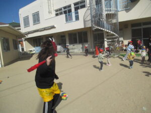 初めに勇気を出して鬼の(お面ではなく)盾を持って立ち向かって行ったのはれもん組(4歳児)の子ども達。それに続きびわ組(5歳児)の子ども達も近づいて豆や新聞ボールを投げますが鬼に見つかって追いかけられ、新聞ボールを捨てて全力で逃げていました。それでもなんとか「おにはぁぁぁそとおぉぉぉ!!!」と大量の新聞ボールを投げて鬼達を追い払うことが出来ました。