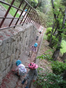 みかん組さん(2・3歳児)も城山公園へお散歩。「こっちいってみよう!」と何人かが進むと、他の子ども達も草むらをずんずんと歩いて行きました。ダンゴムシやバッタを見つけてとても嬉しそうでした。