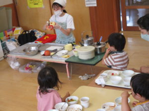 乳児クラスは食育の取り組みで調理の先生からフルーツカットを見せてもらいました。給食の最後に食べるフルーツを目の前で皮を剥いたり切ったりしてもらいます。皮と中身の色の違い、切る前と切った後の形や大きさの違い、断面などなかなかゆっくり見る機会も少ないのでどの子も不思議そうにじっくり見ていました。