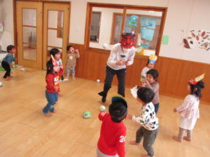今年も節分の会がありました。まずは豆まきのうたを歌ったり節分の由来を聞き、鬼が嫌うヒイラギの葉を触って「ほんまにチクチクする!」、イワシを触って「くさくてヌルヌルする!」と教えてくれる子ども達でした。