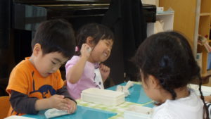 と1人の子が言うと周りにいる友だちもおにぎりを