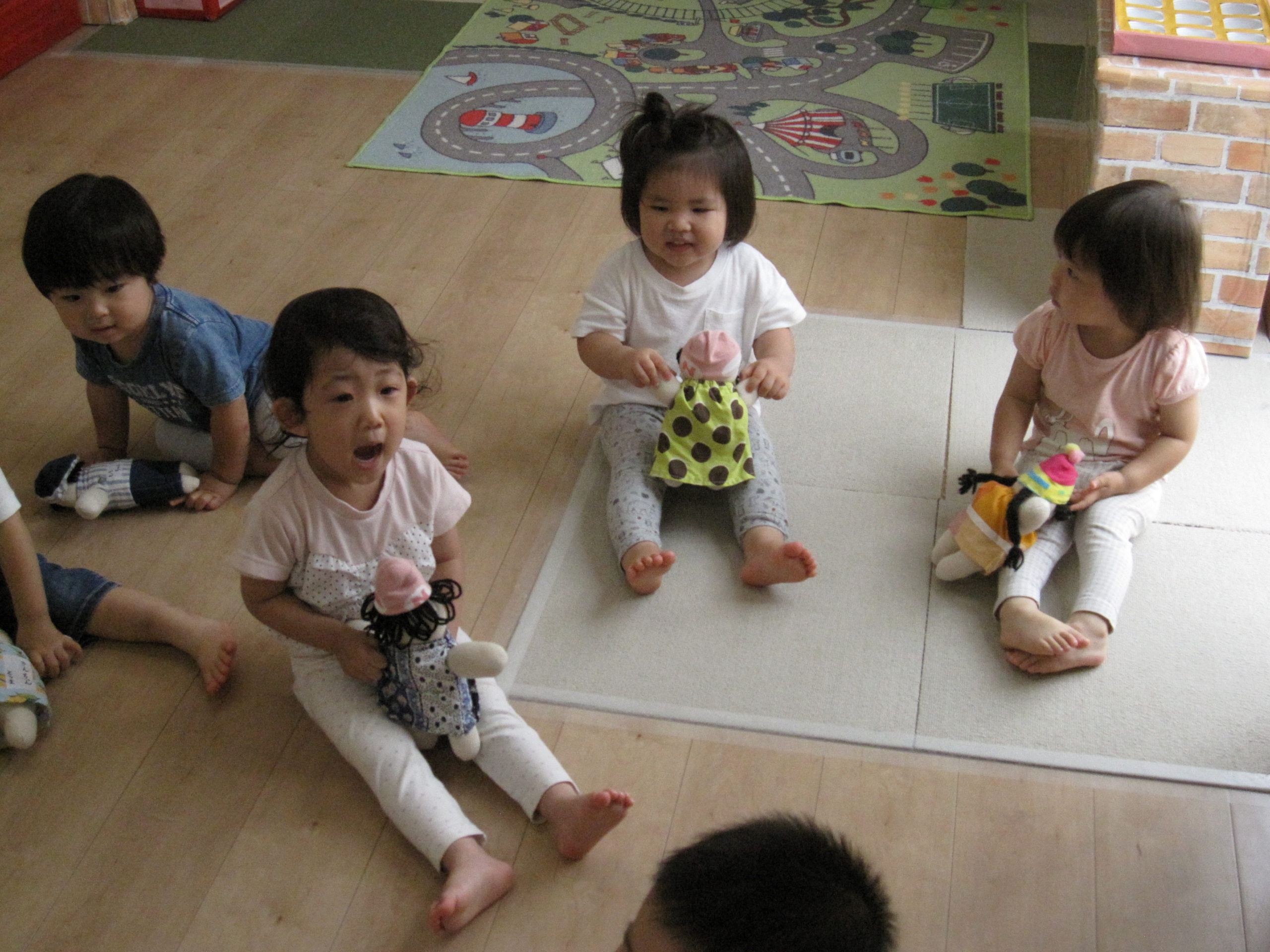 ウォールポケットが、お人形のお家になっています。いっぱいあるお人形の中から、自分のお人形がわかって持ってきて見せてくれます。お人形のお名前も付けてもらって、ミルクを飲ませたり、おむつを替えるふりをして楽しんでいます。