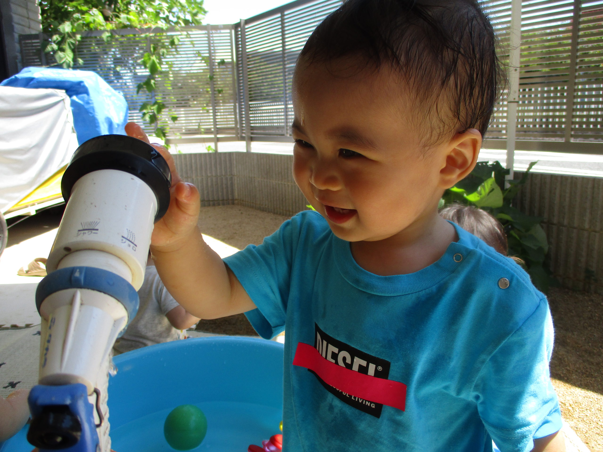 ホースから水が出てくるのが面白くて気持ちよくて、嬉しそうに触っています。