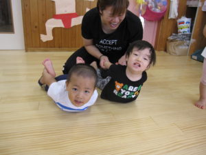 2017年7月26日 日記 1歳児 もも組 かめができたよ! 歌をうたいながら、リズム運動を楽しんでいます。 「身体をそると気持ちいいな。」思わず笑顔が出ています。 お友だちの楽しそうな様子をみていて・・・ 横へ並んでかめになっていましたよ。「いっしょだね!」