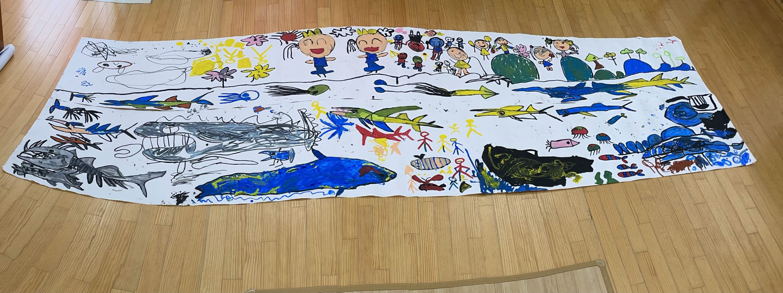 真ん中に線を引いて、「海の中と海の上の島やそこで過ごす子どもたち」というテーマを話し合って決め、みんなで協力しながら描きました。