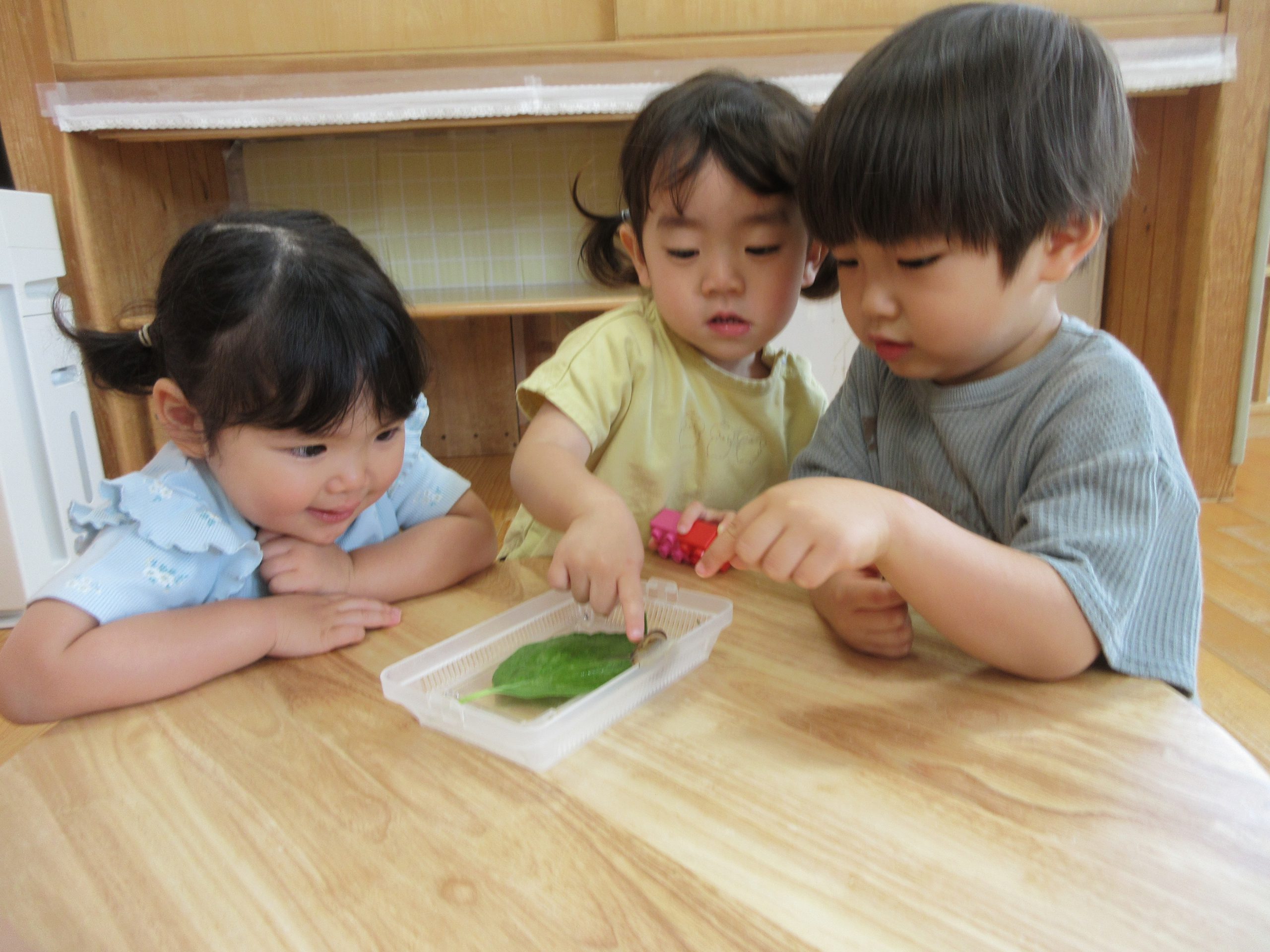 2025年6月9日 日記 2歳児みかん組 みかん組では今、ダンゴ虫とかたつむりを飼育しています。 始めはちょっとこわかったお友だちも、 ダンゴ虫を手のひらに乗せたり、かたつむりをツンツンとつついてみたりして 友だちと楽しんでいますよ!