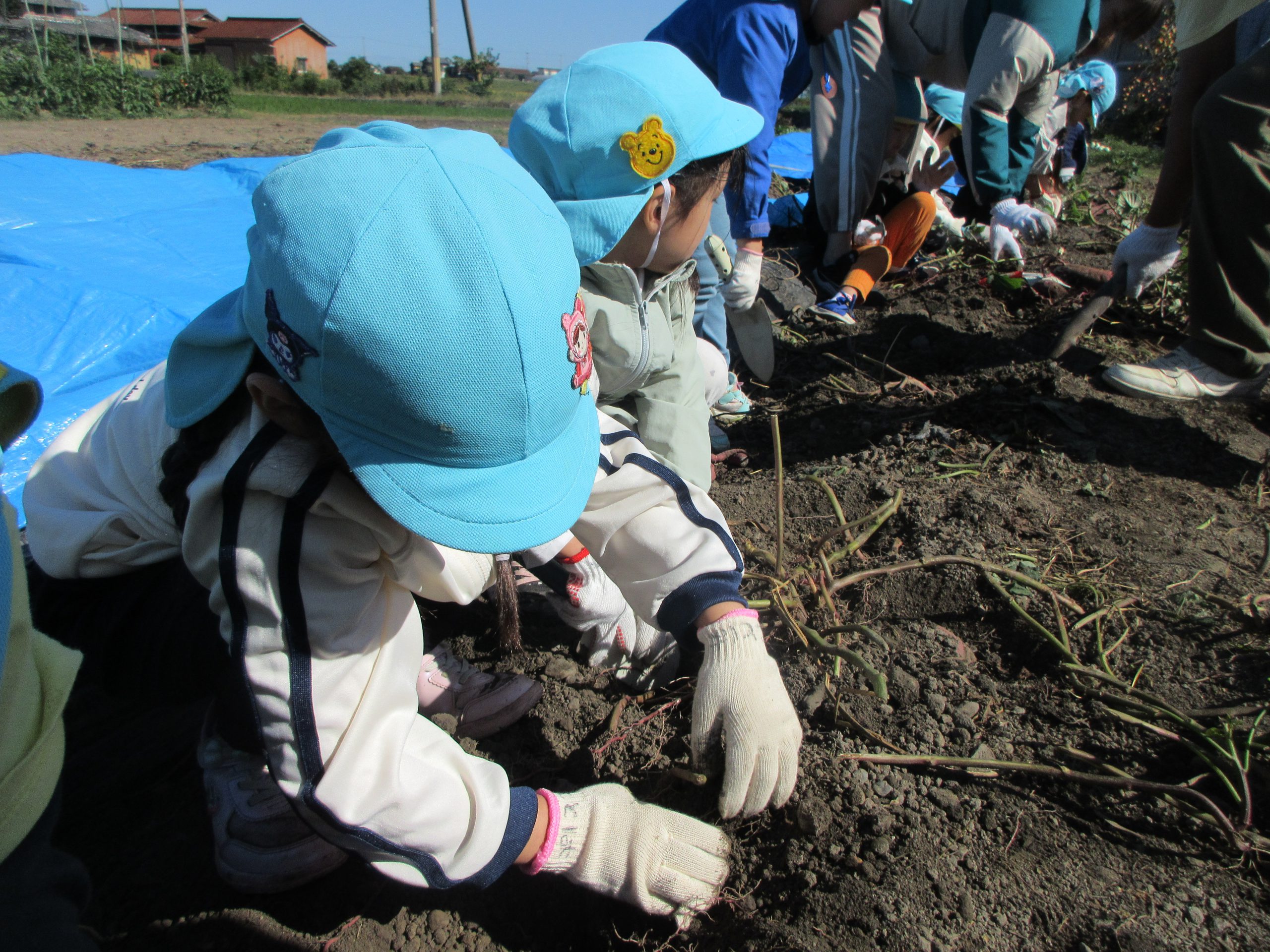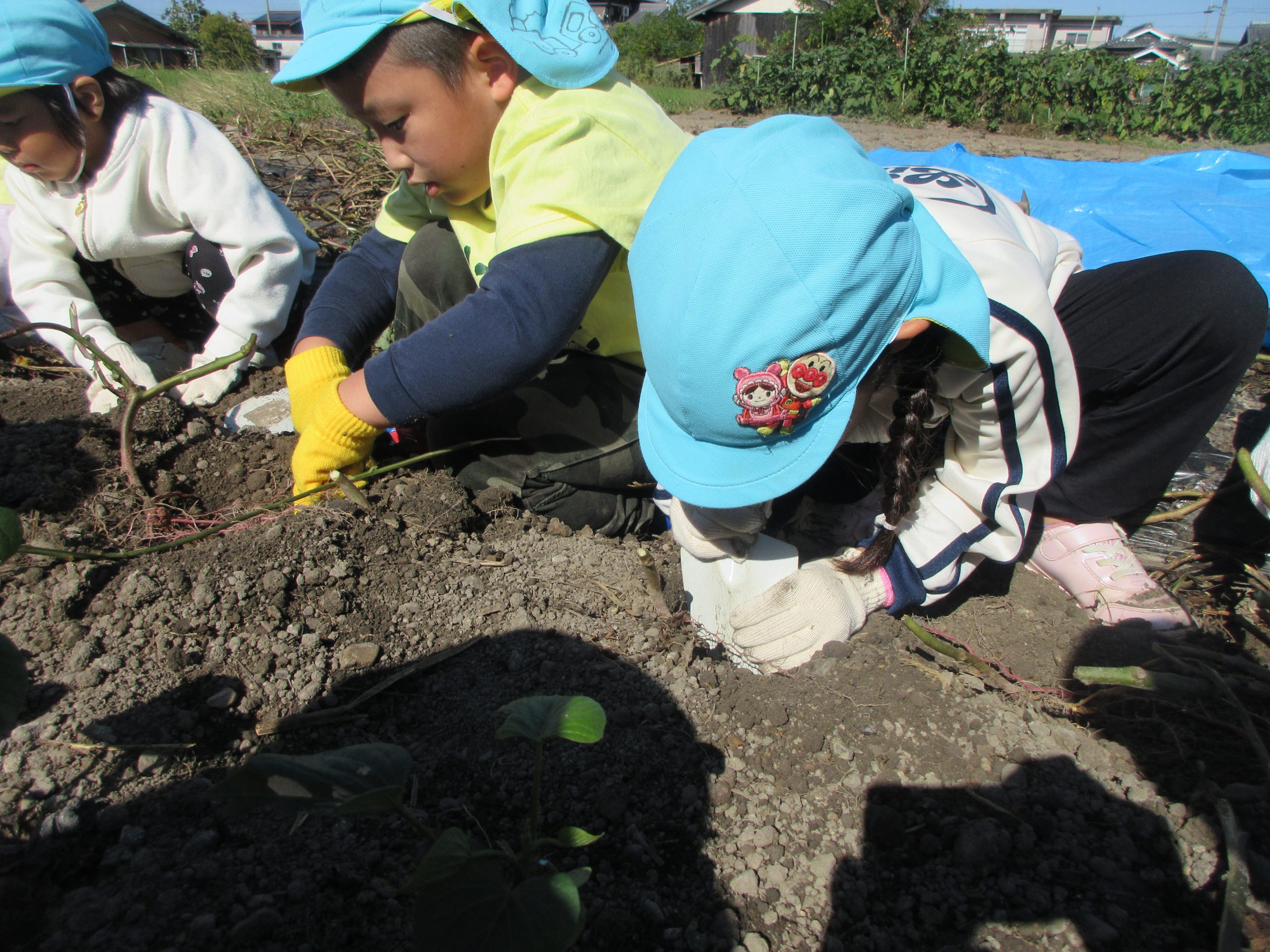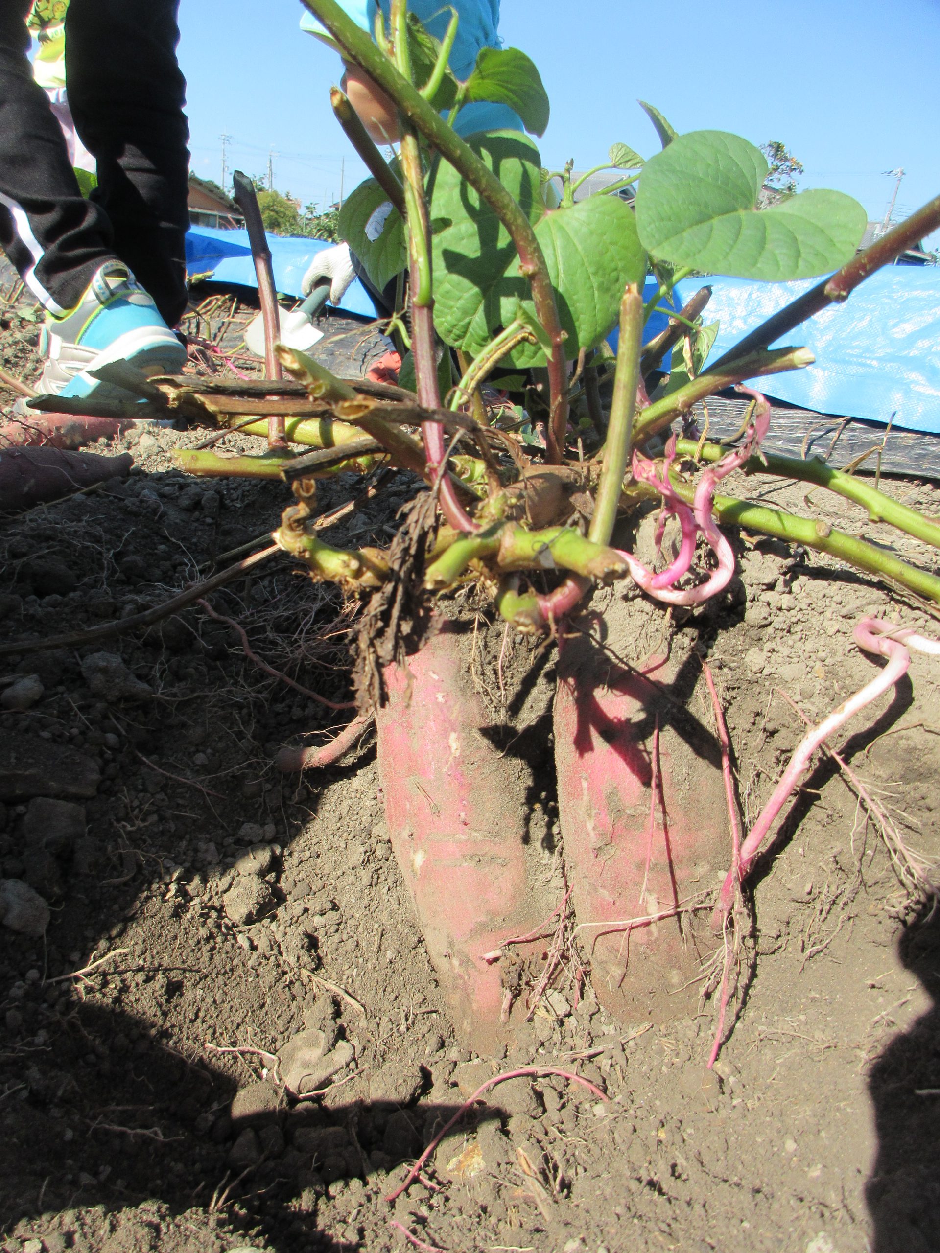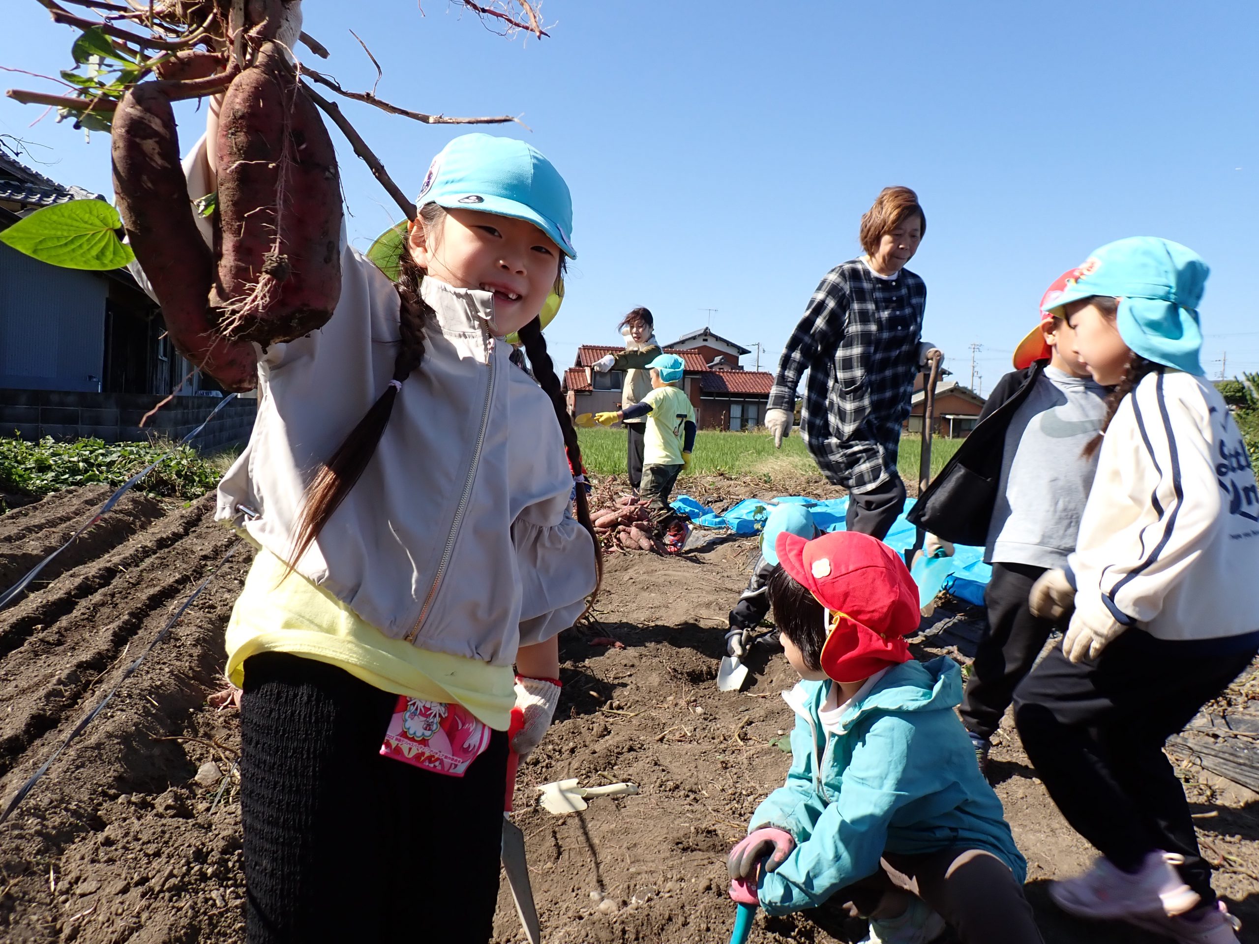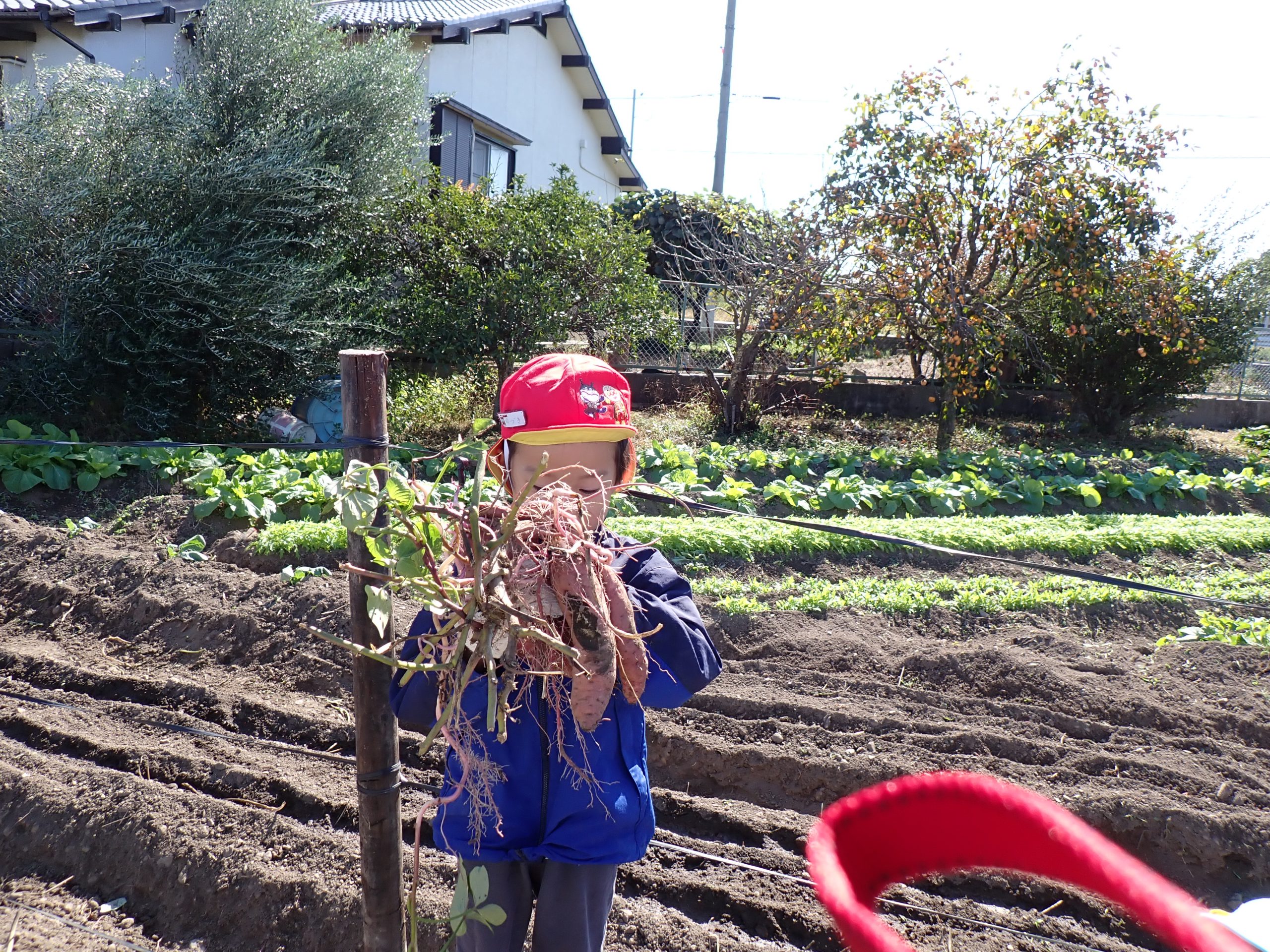 2畝もあり、掘り方もわからず四苦八苦…。農園のお芋先生や枝吉の先生に助けてもらいコツをつかむと、どんどん掘れました!大きな大きなお芋に小さな兄弟芋、たくさん連なった家族芋!!!