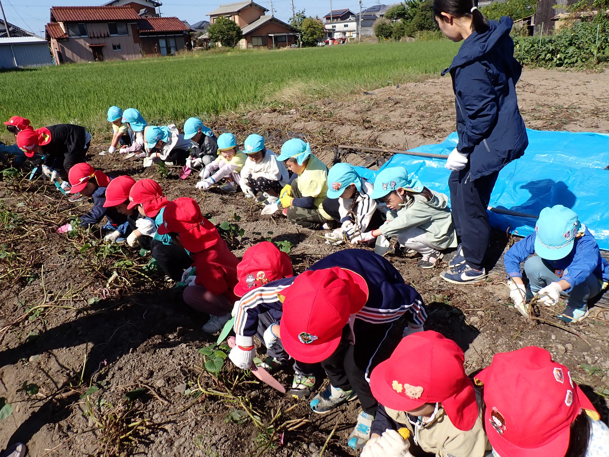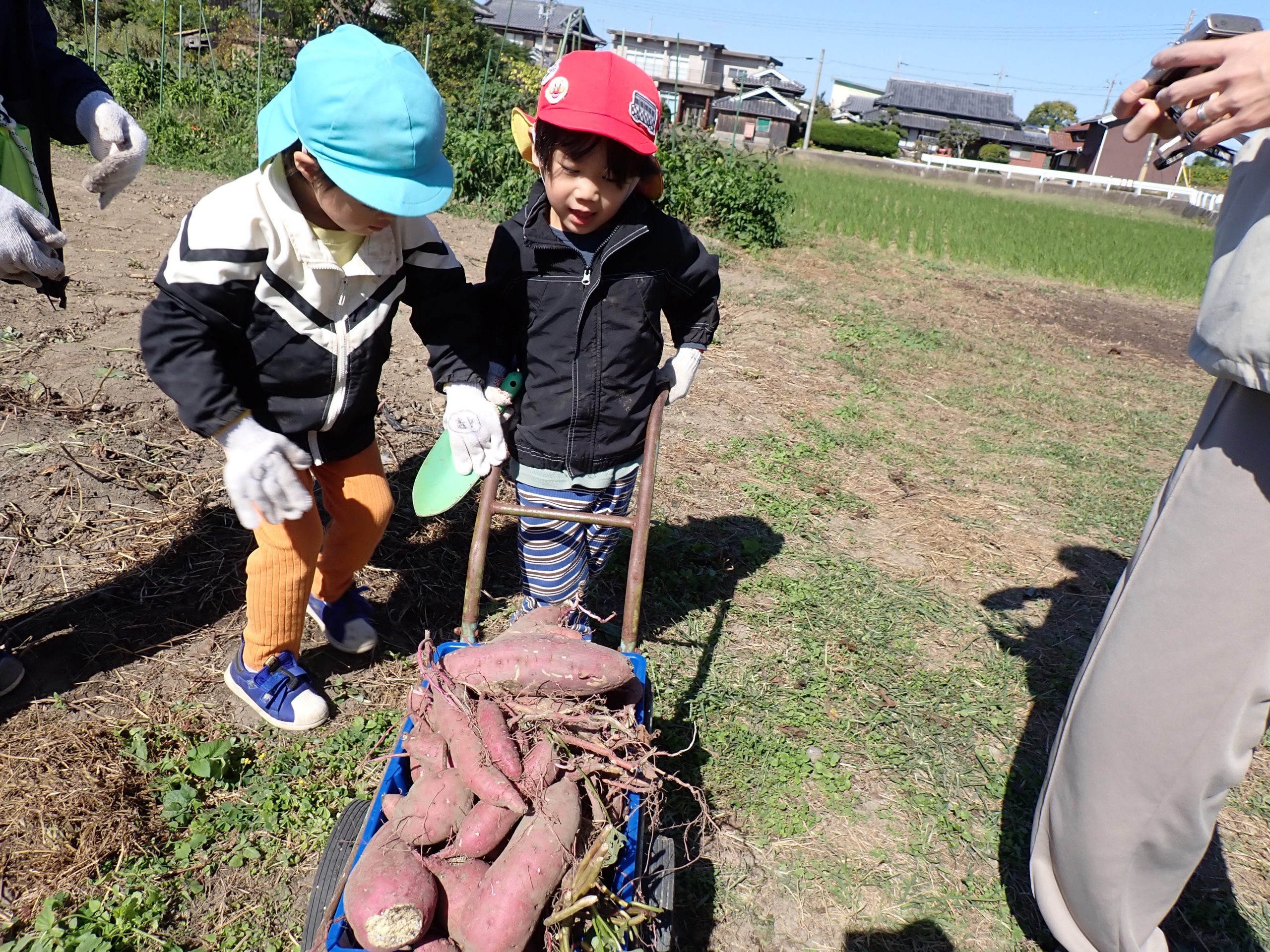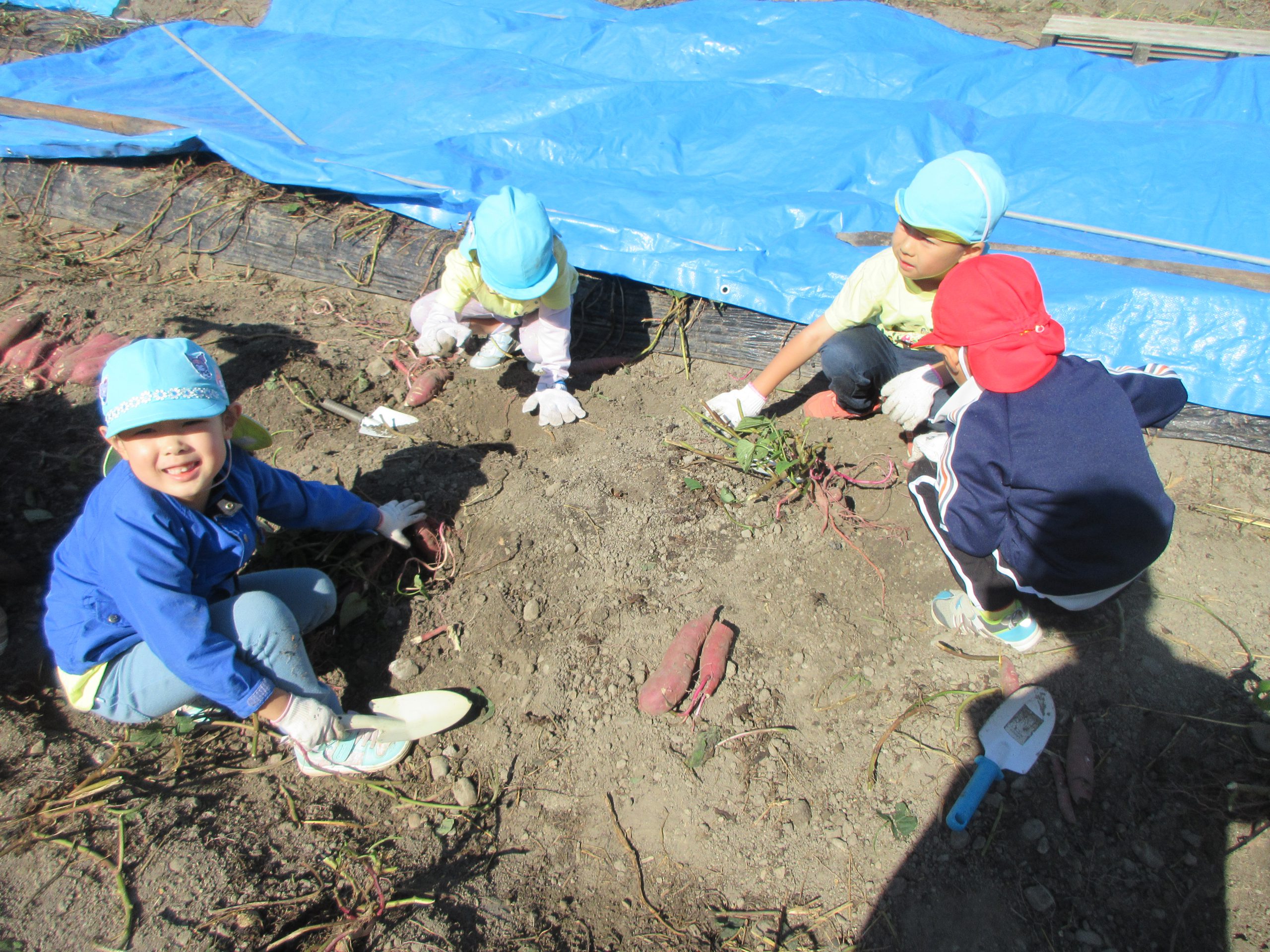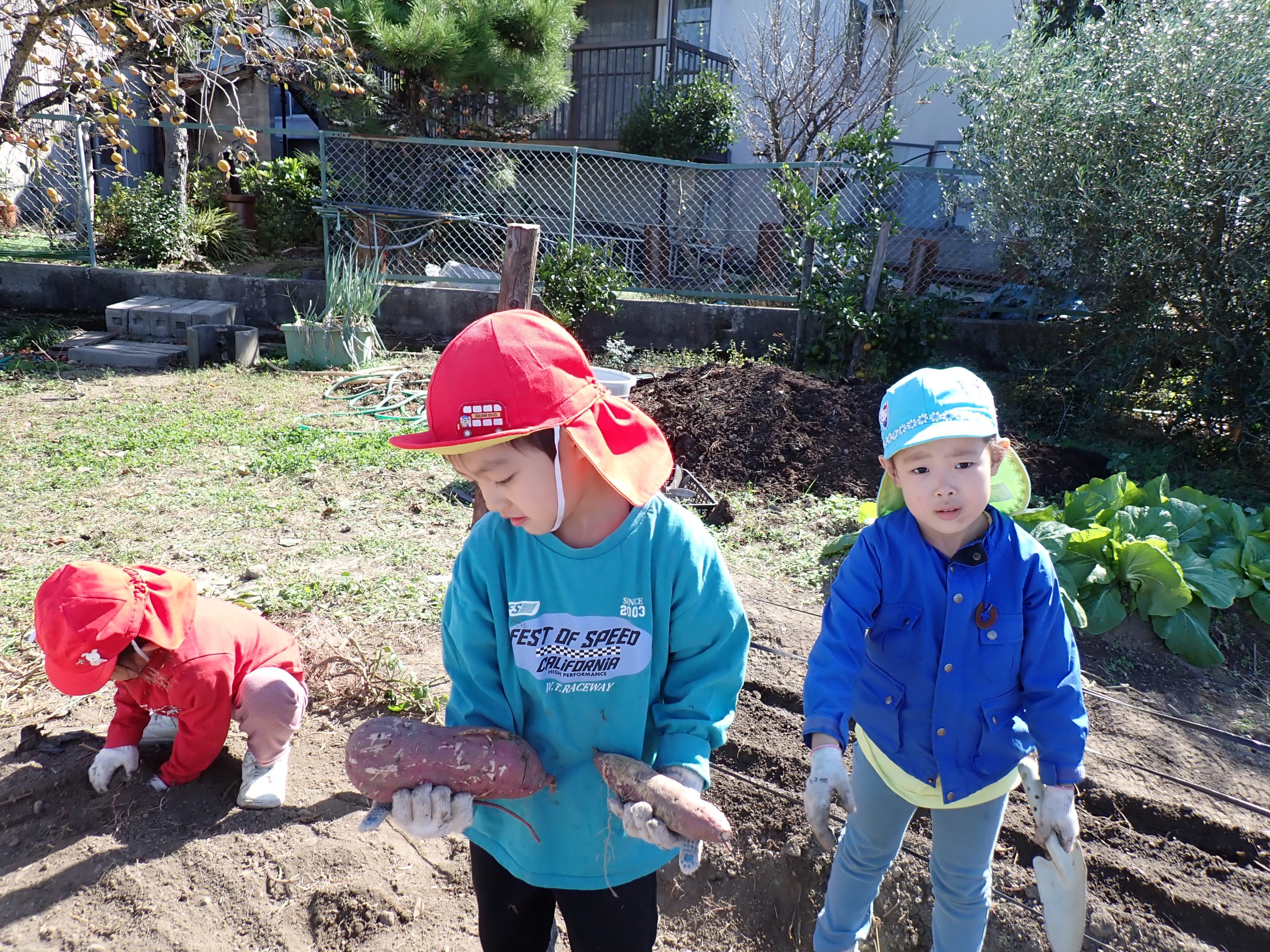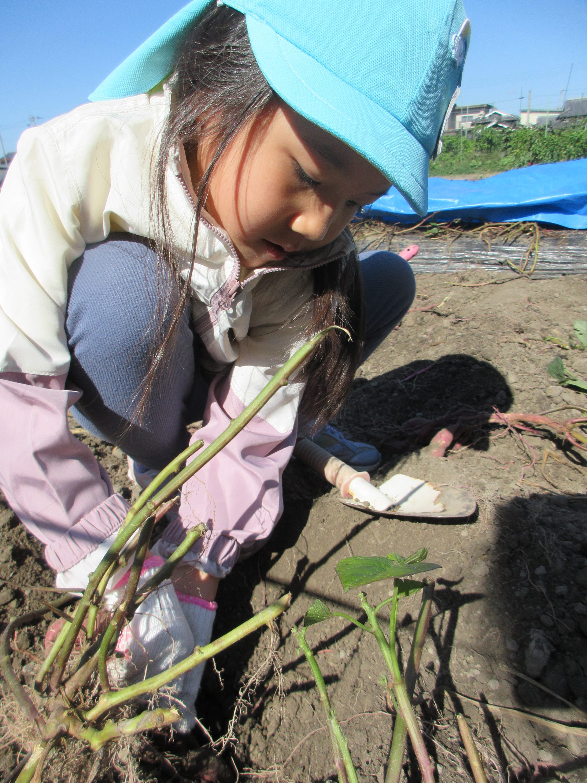 2畝もあり、掘り方もわからず四苦八苦…。農園のお芋先生や枝吉の先生に助けてもらいコツをつかむと、どんどん掘れました!大きな大きなお芋に小さな兄弟芋、たくさん連なった家族芋!!!