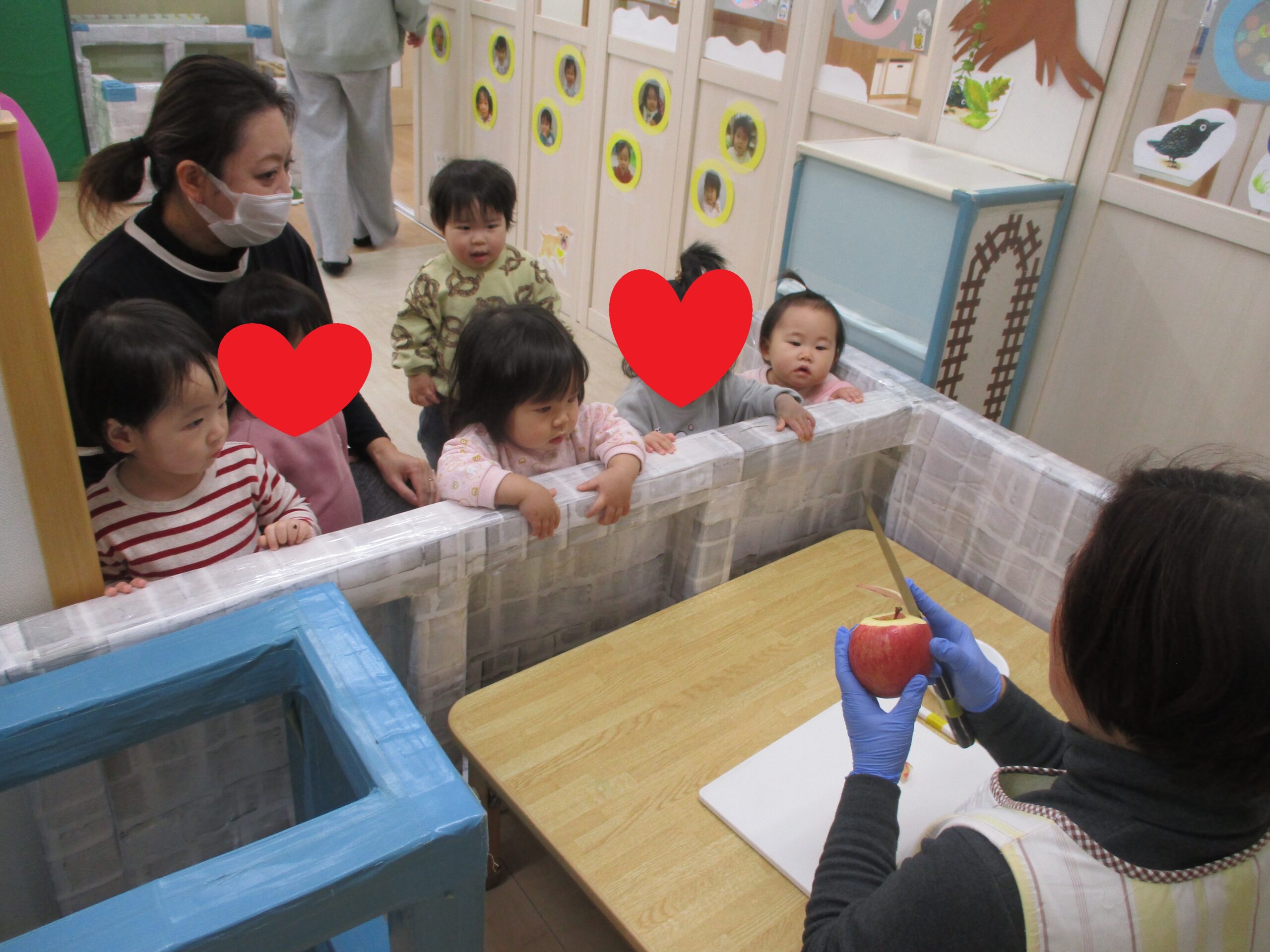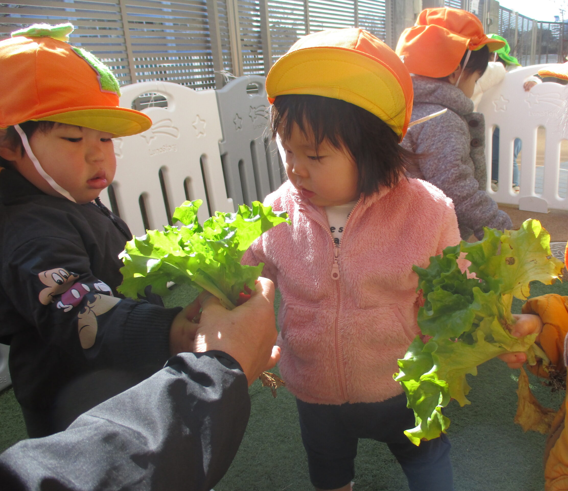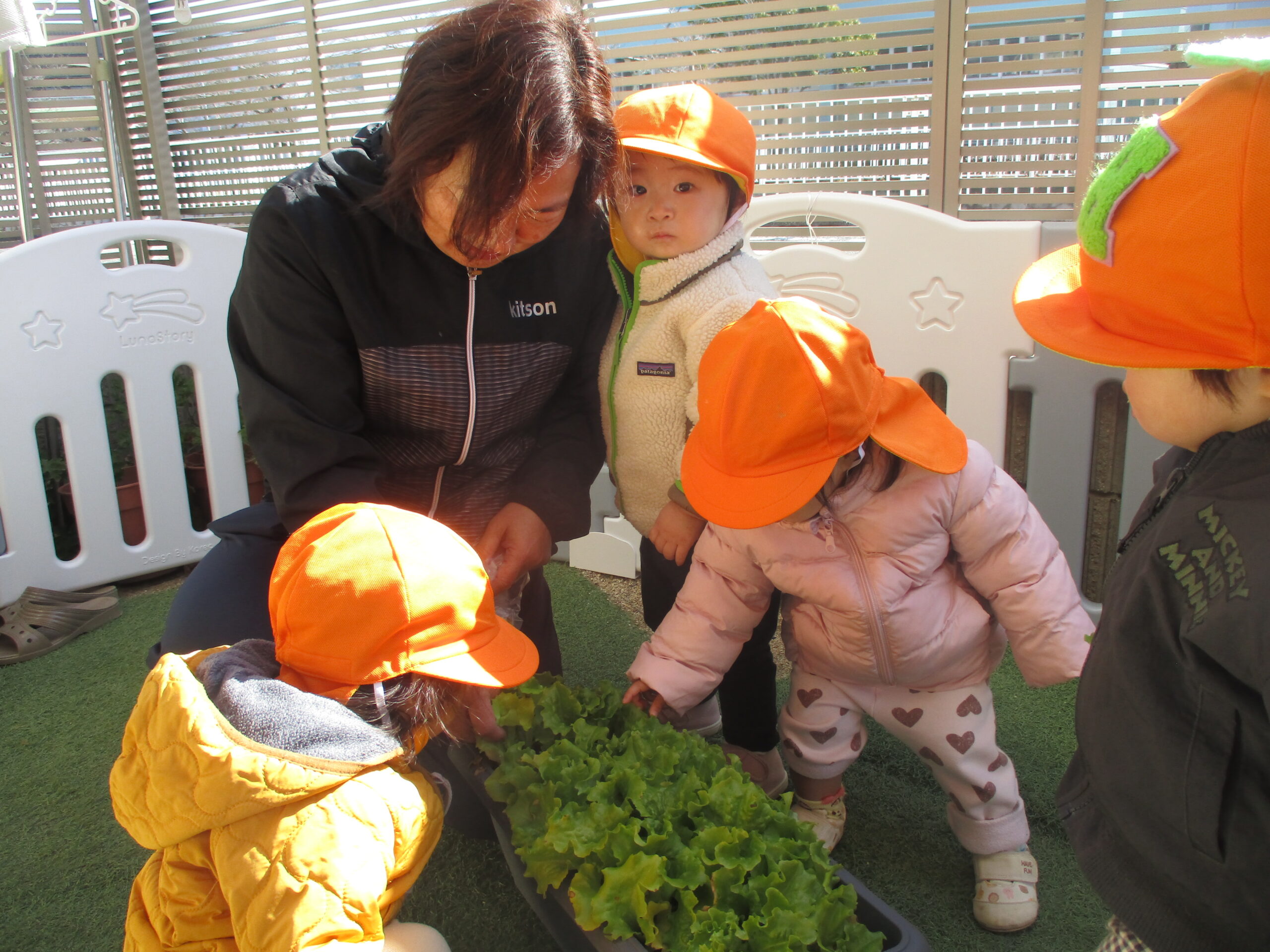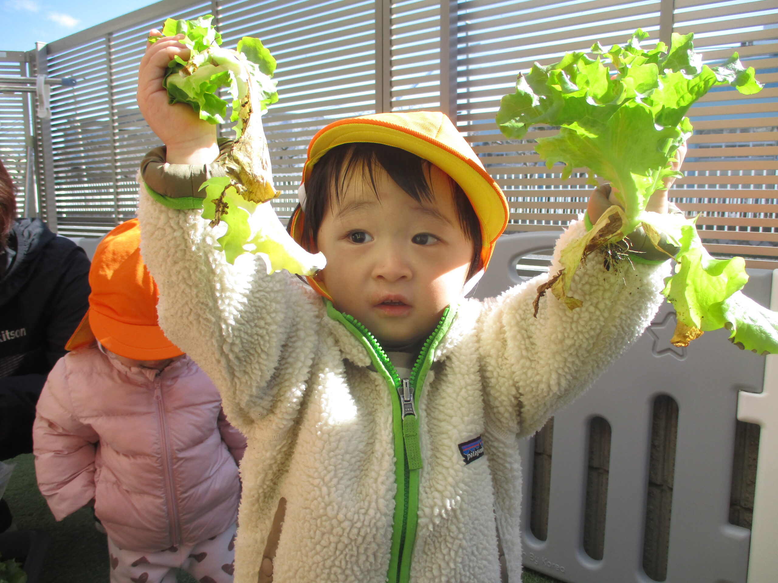 2026年2月20日 日記 0歳児 いちご組 リーフレタスを収穫したよ! 種から育てたリーフレタス。大きく育ったね。 みんなで抜いてみようか。 根が張ってなかなか抜けないね。 このリーフレタスを、中華風スープに入れてもらって食べようね。 りんごの皮むきを見たよ。早く食べたいね。