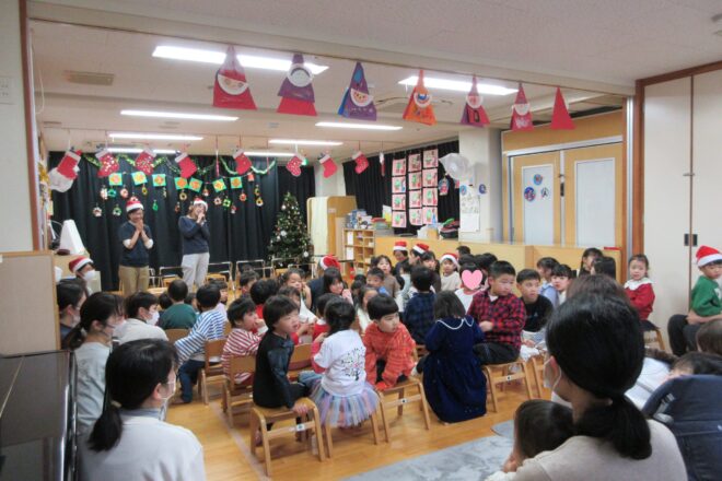 12月20日。クリスマス会をしました。地域のお友だちも遊びに来てくれて、とても盛り上がりました! まずは、2歳児みかんぐみさんのうたとリズム打ち「むっくりくまさん」です。 3歳児りんごぐみさんのうたとリズム打ち「あわてん […]