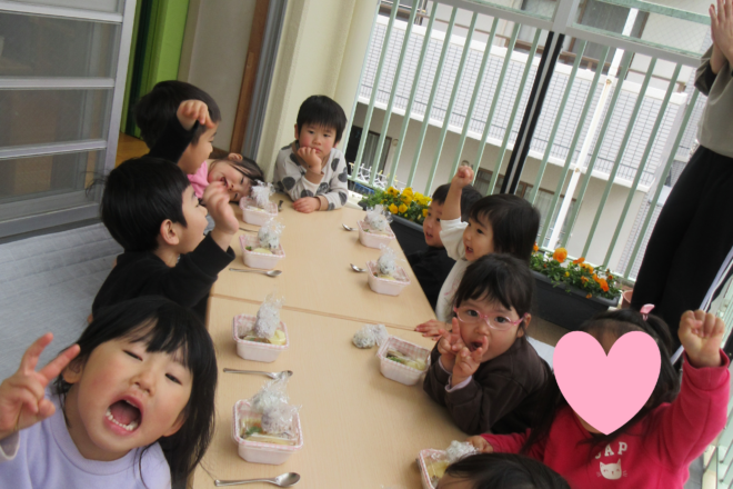 日差しがぽかぽか、春の陽気を感じながら園庭でたくさん遊びました! 最近はおままごと、ピクニックごっこ、土の塊を色々見立てて遊ぶのが好きな子どもたちです。 今日は特別に、調理さんが給食をお弁当風 […]