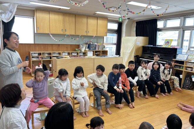 本園のひなまつり会の様子です! 2歳児から5歳児で、歌を歌ったり、ペープサートを見たり、最後にはクイズもしましたよ!! 真剣に見てくれる姿が可愛かったです!