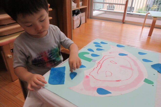 暑い日が続き、セミの鳴き声が聞こえきたのでみんなで探しに出かけました。 公園の木や葉っぱにセミの抜け殻を発見!みんでたくさん見つけて保育園に持って帰りました。 その後…クラスの壁にみんなで木を作りました。 画用紙を破って […]