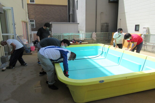 気温30℃。梅雨明け間近の本日。保護者会有志のお父さんたちが集まってくれて、幼児さんのプールを組み立ててくれました。 重たい重たいプール。お父さんたちが、力を合わせて「せーのっ!」と軽々持ち上げてくれました。 去年は、コ […]