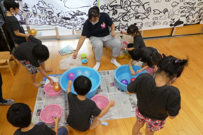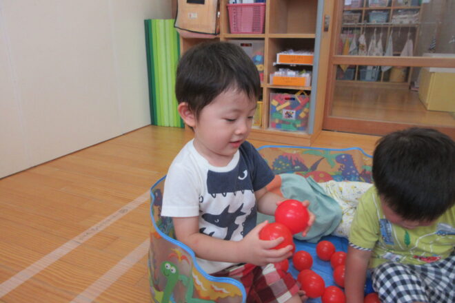 お部屋でボールプールをして遊びました♪ プールに入った時のための泳ぐ練習もしました! 「バチャバチャ~!!」 「たのしい!」と大喜びのみかん組さん(^^♪ 「プールでもいっぱい泳ぐぞ~!!」