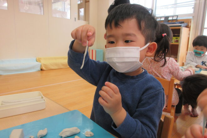 りんご組さんなって自分の粘土で遊びました! ふたを開けて取り出す時「固いな~」「大きっ‼」と言いながらもとても嬉しそうな表情なりんごさん!(^^)! 「見てー!ヘビさんだよ!」 「電車できたよ!(^^)!」 次々とみんな […]