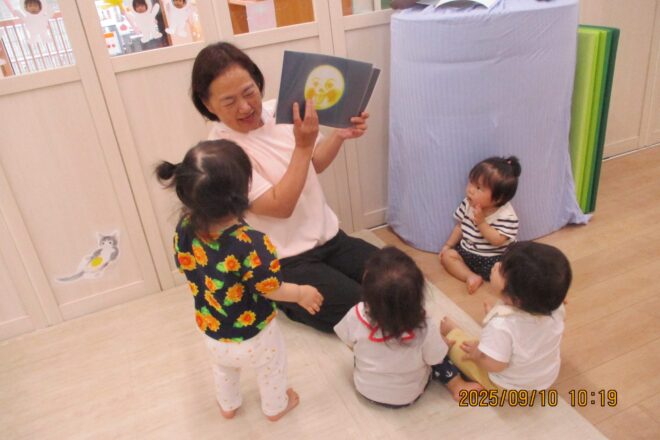 9月の絵本「おつきさまこんばんは」が大好きないちごさんです。 マジックシアターで、お月様のいないいないばあをして遊びました。 出たりかくれたりして、楽しかったね。