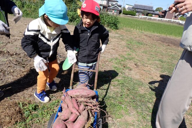 お天気にも恵まれ、バスに乗って芋ほり遠足に行ってきました! 2畝もあり、掘り方もわからず四苦八苦…。農園のお芋先生や枝吉の先生に助けてもらいコツをつかむと、どんどん掘れました!大きな大きなお芋に小さな兄弟芋、たくさん連な […]