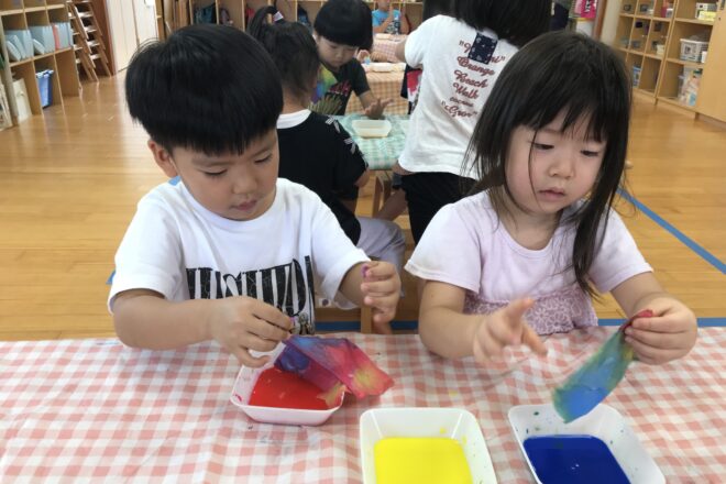 半紙に絵の具を使って染めました。 半紙を小さく折りたたんで… 黄、赤、青色の絵の具薄い順番に浸けましたよ。 そーっとはがしています。 何が出来上がるかはこれからのお楽しみ☆ 散歩先でかけっこし […]