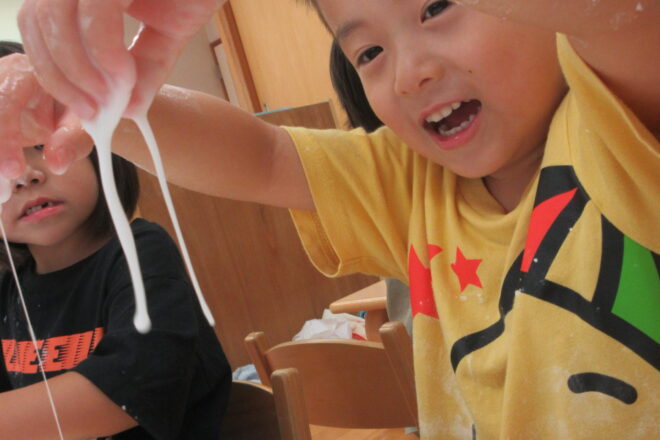 先日は片栗粉を使って感触あそびをしました。 粉からドロドロになる変化を楽しみました。 なんだか不思議… おもしろいね! どろ~ん!! 腕にもかけちゃお~ 他には 道具を使って入れたり、 混ぜた […]