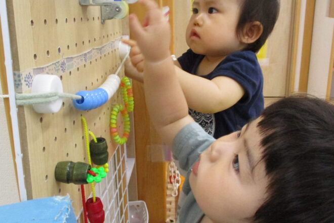 今日はお部屋で遊んでいます。 牛乳パックで作った仕切り越しに目が合いました。 これはなにかな~? 上手にぽっとんすると、ボールが出てきたよ。 おもしろいな、もういっかい! &nb […]