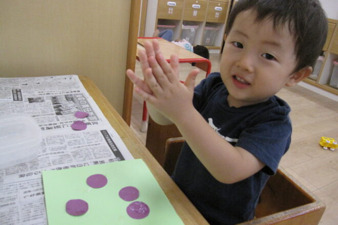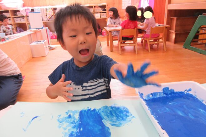 水遊びを楽しんできたみかん組さん。初めてフィンガーペイントを楽しみました。「てんてん!」と色を塗っていく事を楽しんだり、手のひらにたくさんつけてペタペタ色を重ねていく事も楽しんでいました。 「見てー!こんな色になったよ! […]
