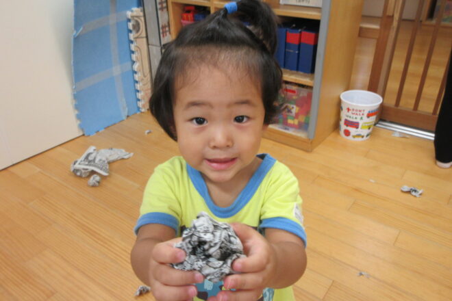 今日も元気よく遊んでいる、みかん組さん!お部屋で楽しく新聞あそびをしました。音を鳴らしたり、破るのが楽しく何度も何度も繰り返していました。 丸めて…「みてー!おにぎりできたよ!!」上手に破ったり… 帽子にしてみたり… 「 […]