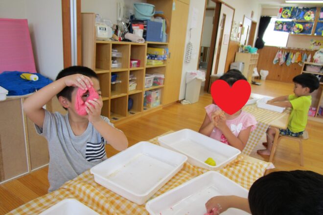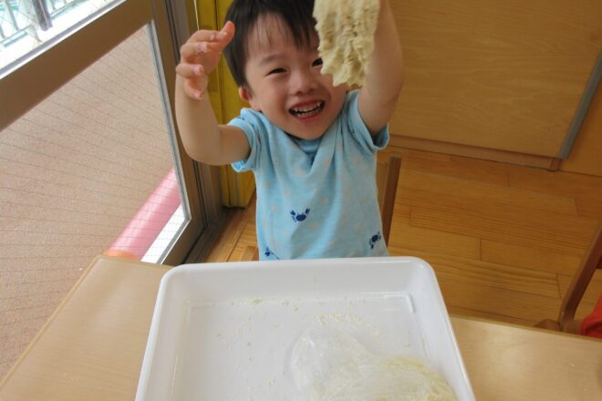 最近、雨の日も多かったので小麦粉粘土で遊んでいました。 まずは小麦粉の感触から! 粉を触ったり、色んな粘土の固さの粘土を楽しみました。 めっちゃベタベタや~!! お次は絵の具を入 […]