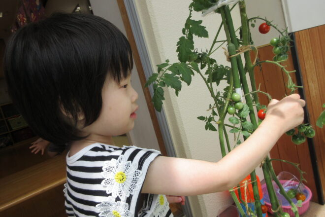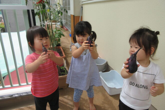 春からプランターでミニトマト、なすびを育ててききたみかん組さん。 毎日水やりもして、どんどん成長して真っ赤なミニトマトがたくさんできました。 「こっちにも、いっぱいあるよ!」 「見てー!採れたよ!」 立派ななすびも4本採 […]