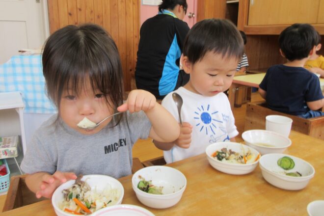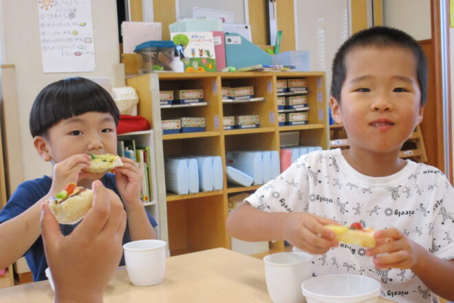 毎日お当番さんが水をあげてくれ、夏野菜もすくすく育ちました。 これまで取れた野菜を紹介します! まずはピーマン! おやつのピザに乗せて食べました。 保育士が作っている様子を楽しそうに見てました […]