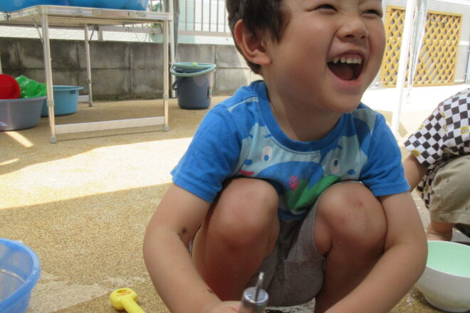 今日も水あそびをして楽しんで過ごしました。 ビニールプールに入ってる水をみんなでタライに入れていきます! 「大きいバケツでも持てるで!見て!!」 「もうすぐ(タライの水が)いっぱいなりそう~」 […]
