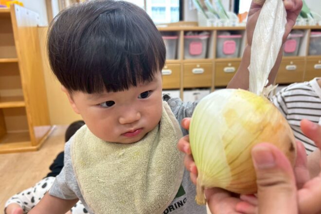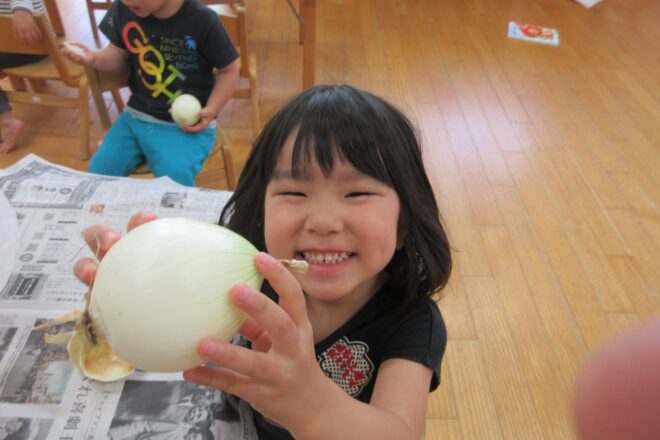 玉ねぎの皮むきをしました♪ 子どもたちがむいた玉ねぎは、ビーフシチューに入っていました(^^)/