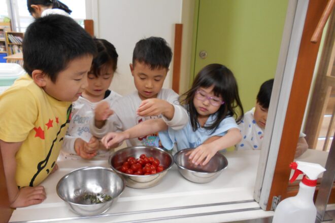 朝、登園している子ども達に野菜の下処理のお手伝いをしてもらっています♪ トマトのヘタを取ったり、豆腐をスプーンで小さく分けたりなど、みんなお手伝いを頑張ってくれています。