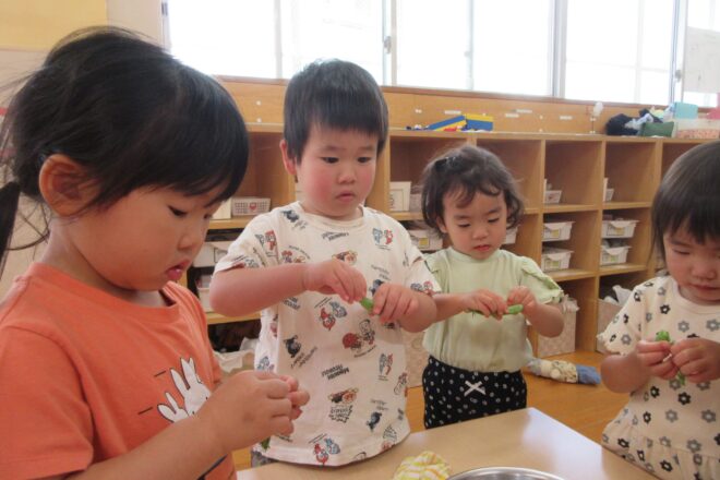 調理さんのお手伝いで、スナップエンドウのさやむきをしました。 給食のスープに使ってもらいました!