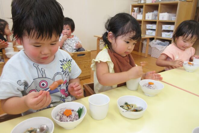 6月17日(火)はごちそうの日でした。 メニューは ・あじさいごはんとウインナーのかたつむり ・白身魚ののりやき ・ほうれん草のお浸し ・なめこの味噌汁 ・オレンジ でした。