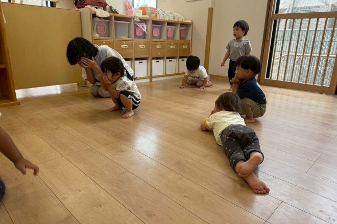 もも組のわらべうたです(^^)/ キリギリスの飛ぶ真似をしたり、隠れたりしています! みんな大好き、”高い山~♪低い山~♪” 楽しかったね!